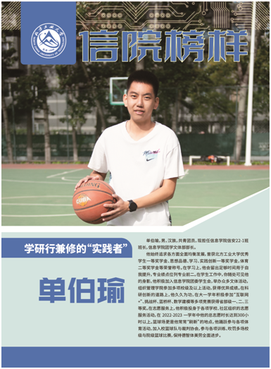 参加多项校级及以上活动,获得优异成绩。在科研创新的道路上,他久久为功,在大一学年积极参加“互联网+”、挑战杯、蓝桥杯、数学建模等多项竞赛获得省部级一、二、三等奖。在志愿服务上,他积极投身于各项学校、社区组织的志愿服务活动,在2022-2023一学年中他的总志愿时长达到300小时以上。篮球场更是他常常“刷新”的地点,他踊跃参与各项体育活动,加入校篮球队与裁判协会,参与各项训练、吹罚多场校级与院级篮球比赛,保持德智体美劳全面进步。