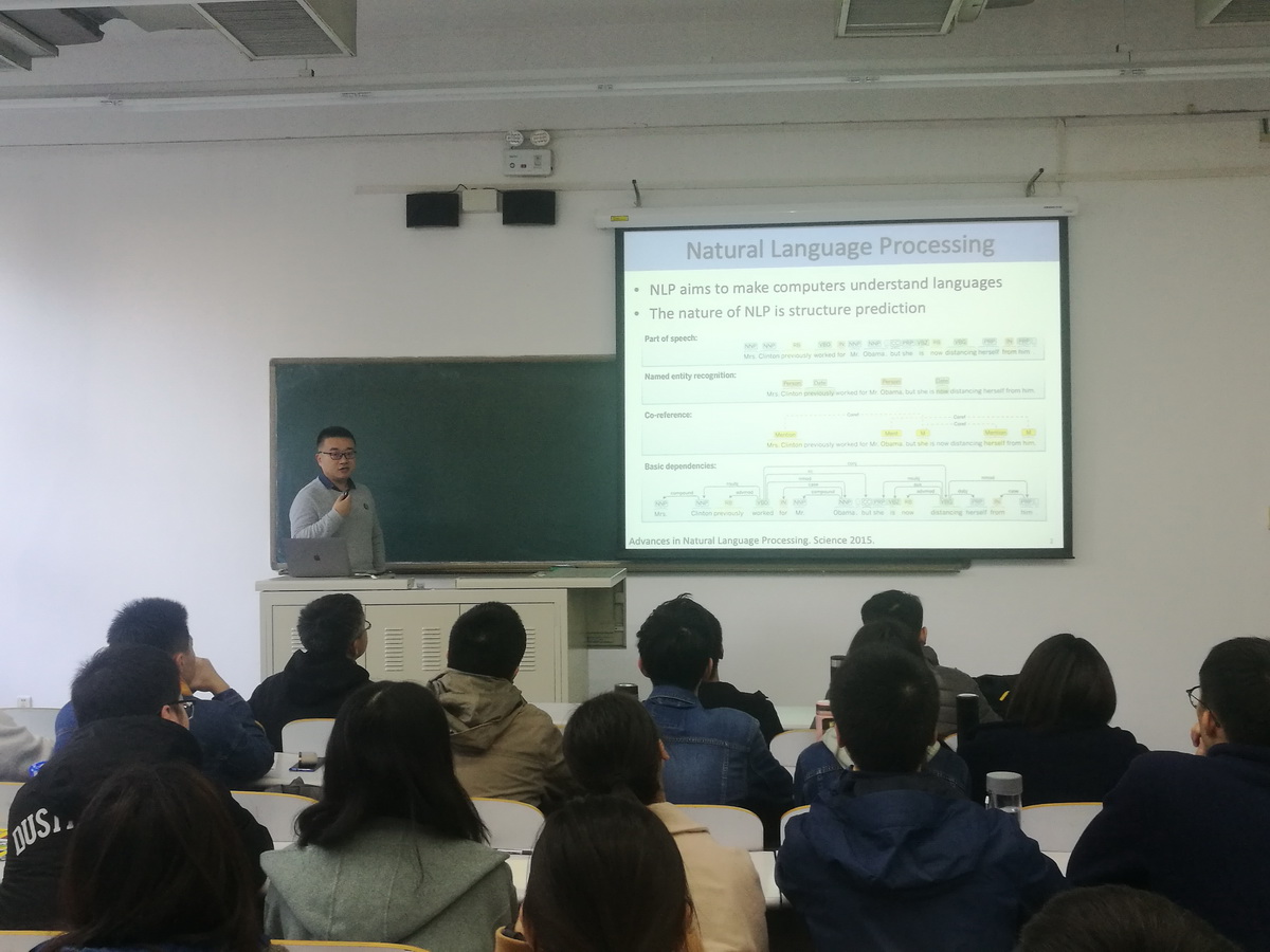师生作了题为《知识指导的自然语言处理》的学术报告。报告会由计算机系主任段建勇教授主持。