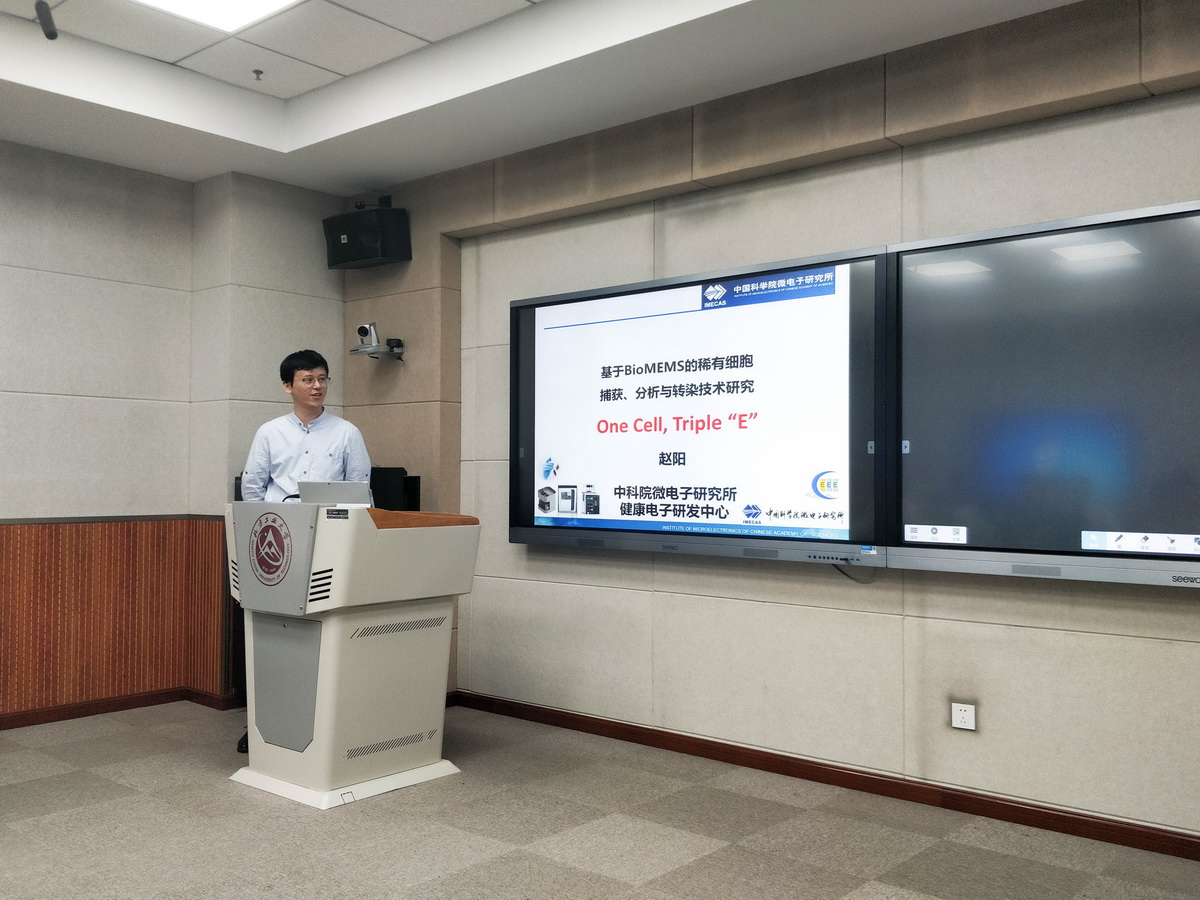报告介绍了中科院微电子所健康电子中心的研究布局,分析了面向健康领域的行业应用和前沿基础研究需求,阐述了开展健康电子系统、特色软硬件产品及核心芯片的研发方法。赵阳博士还重点介绍了所从事的健康领域核心芯片技术,其研制的MEMS微纳传感器件及系统,成功实现了对单细胞的fF级的微弱电学特征差异的高通量(>10万细胞)检测,并实现了仪器化。报告会结束后,赵阳博士就师生的提问进行了详细的解答。