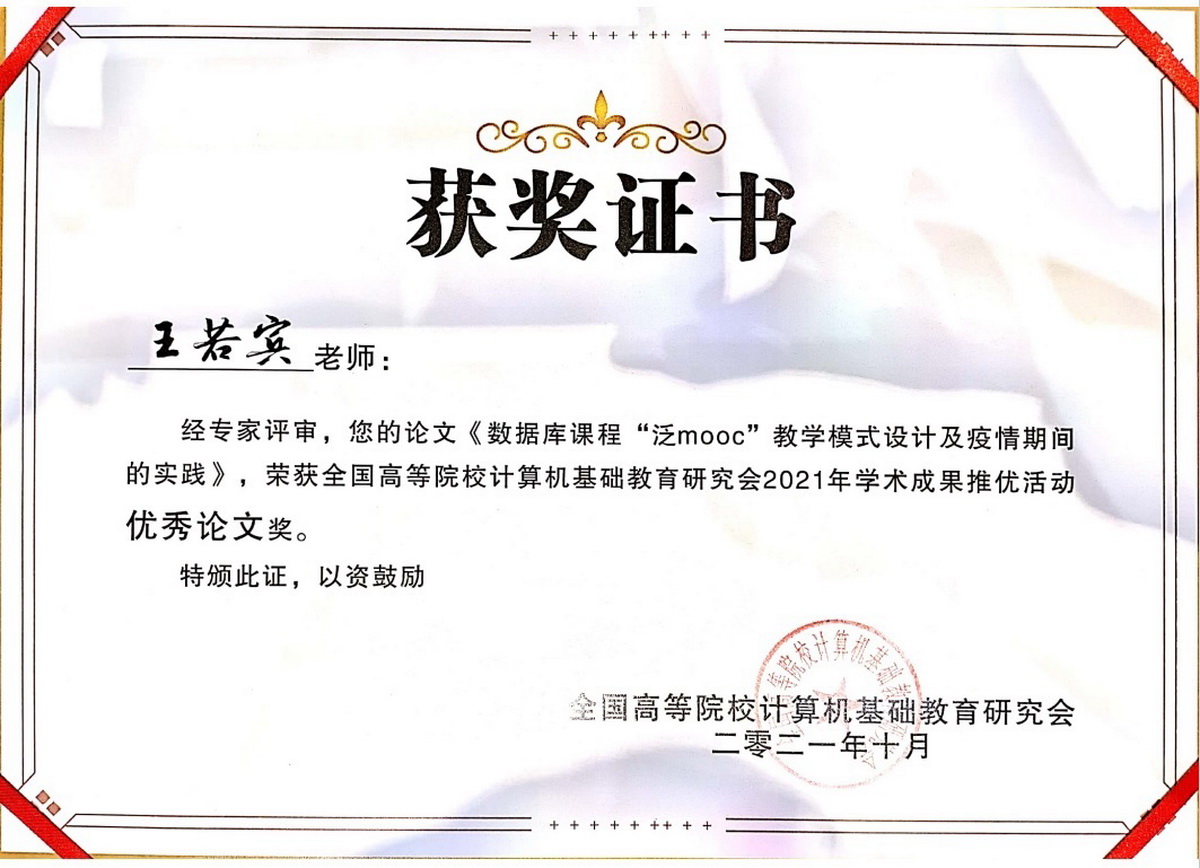 此次王若宾老师获奖的论文发表于《计算机教育》2021年第6期。论文针对疫情期间的教学实际提出“泛MOOC”教学模式,并在我校2020春季学期数据库课堂开展了教学实践,展示了我校教师在“停课不停学”期间的教学研究成果。