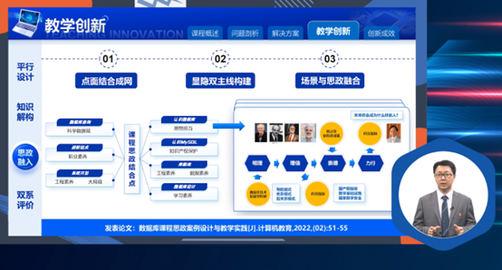 教师王若宾代表《数据库应用基础》课程组汇报的“基于‘平行+重构’的迭代迁移教学法混合式教学设计创新与实践”详细阐述了课程中的混合式教学设计创新理念与实践方法。作为应用型数据类基础课,48学时课程面向统计学、信息科学与技术、大数据等专业开设,32学时课程面向工商管理、会计学、工程管理等经济管理类专业开设。教学结合数据库课程特点和学情实际,以面向地方发展培养应用型专门人才目标为导向,提出“实践先导、思维提升、科学学习”的教学创新理念,通过夯实数据应用能力、服务专业能力发展,在通识型计算机基础课与专业课之间起到承上启下的作用。结合学校办学定位和专业能力发展需要,本课程采用迭代迁移的混合式教学,贯通课前、课中和课后,使学生逐级掌握数据库基础原理和技能,进而具备解决复杂数据存储、检索以及应用设计问题的能力,进一步适应大数据环境下应用复合型专门人才的培养需要。