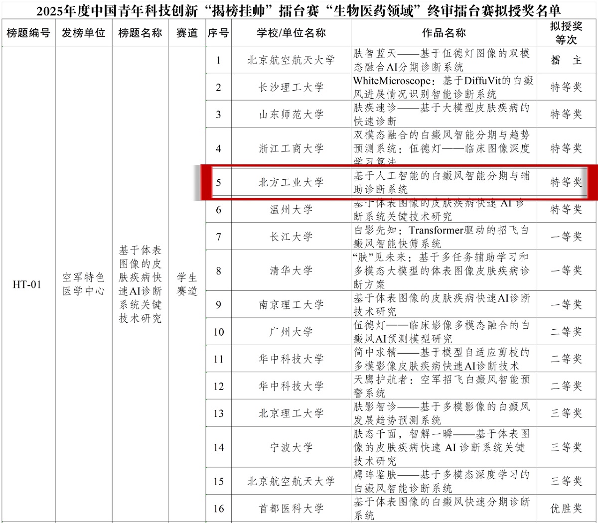 李琛老师、段建勇老师和乔梦宇老师指导,李琛老师课题组计专研张晓亮和管璇等同学作为主要负责人的项目《览图智诊——基于人工智能的白癜风智能分期与辅助诊断系统》在本次擂台的激烈角逐中脱颖而出,以扎实的研究基础、创新的解决方案和精彩的现场答辩赢得了学术和产业界专家的一致好评,荣获大赛特等奖!