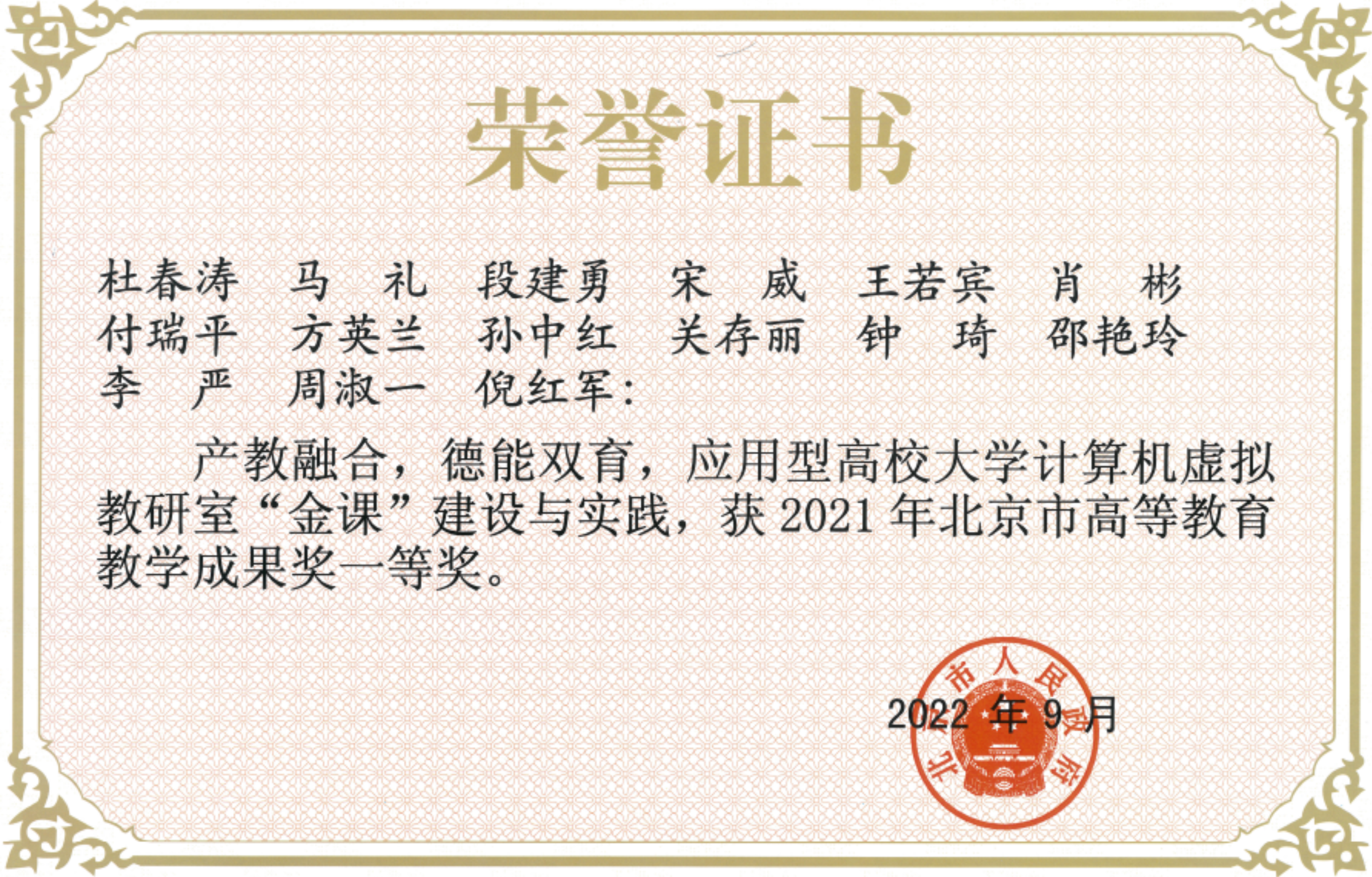 近年来,杜春涛教授主编的教材《新编大学计算机基础》和《微信小程序开发案例教程(慕课版)》,建设的MOOC《Angular Web前端框架开发基础》分别获2019年、2021年和2022年北京高校优质教材课件(重点),主讲的《Java程序设计》课程获北京高校优质本科教案,申报的教学成果《产教融合,德能双育,应用型高校大学计算机虚拟教研室“金课”建设与实践》获2021年北京高等教育教学成果一等奖。