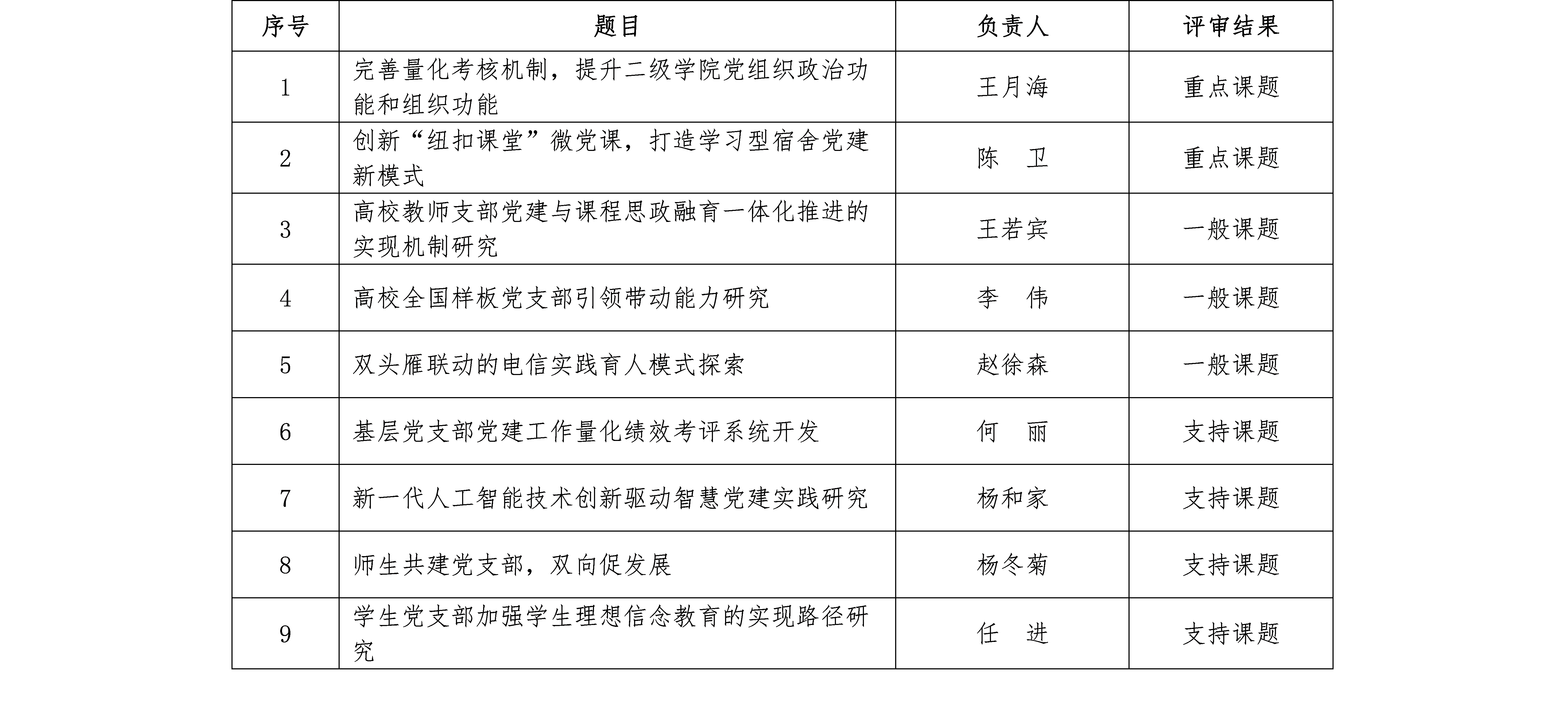 重点课题2项,一般课题3项,支持课题4项,共9项党建研究课题立项(详见附件1),课题研究期限为1年。